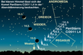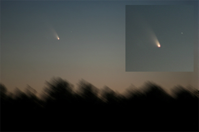 Tief am Westhorizont ist bei klarem Himmel derzeit der Komet "Panstarrs" zu sehen. Der Schweifstern ist abends nach Sonnenuntergang sichtbar. Allerdings muss man schon genau hinschauen, um ihn zu finden, denn er ist so gerade eben noch mit bloßem Auge zu erkennen, wenn keine anderen störenden Lichtquellen in der Nähe sind. Bei dunstigem Himmel oder in den lichtüberfluteten Ballungsgebieten kann der Komet oft nur mit einem Feldstecher gefunden werden.