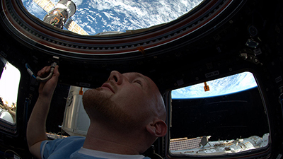 In der Schwerelosigkeit der ISS gibt es kein oben und unten. Es kommt nur auf die Perspektive an. Hier entscheidet sich Alexander Gerst für den Blick nach "oben" zur Erde. Bild: ESA