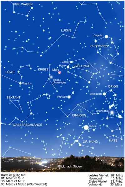 Der März ist der typische Frühlingsmonat. Am ersten Tag des Monats beginnt der meteorologische und am 20. März der astronomische Frühling. Nach dem langen und strengen Winter können wir im März nach dem Naturkalender mit dem Vorfrühling rechnen, der mit der Blüte von Schneeglöckchen und Krokussen beginnt. Auch am Himmel drängen von Osten her Frühlingssternbilder wie Krebs, Löwe und Wasserschlange ans Firmament, während am westlichen Himmelsgewölbe noch Wintersternbilder wie Orion, Zwillinge und Großer Hund verharren.