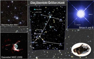 Neben Sirius bietet der Große Hund weitere Leckerbissen für Ferngläser und kleine Teleskope. Der offene Sternhaufen M41 kann in dunklen Nächten schon mit dem bloßen Auge als schwacher Nebelfleck gesehen werden, bereits im Fernglas ist er gut als Sternhaufen zu erkennen. Der Doppelstern 145 CMa wird auch "Albireo (= wunderschöner Doppelstern am Sommerhimmel) des Winterhimmels" genannt. Schon in einem guten, auf einem Stativ fixierten Fernglas oder einem kleinen Fernrohr erkennt man den orangefarbenen Hauptstern mit seinem bläulichen Begleiter.
