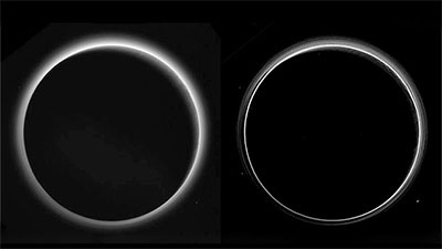 Sensation: Die Gegenlicht-Aufnahme des Pluto offenbart mehrere Dunstschichten und somit eine, wenn auch sehr dünne Atmosphäre. Bild: NASA/Johns Hopkins University Applied Physics Laboratory/Southwest Research Institute