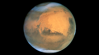 Der Mars aus Sicht des Weltraumteleskops Hubble. Er steht Ende Juli in Erdnähe und ist dann nur rund 55 Millionen Kilometer von der Erde entfernt. Weil er der Sonne dabei gegenübersteht, erscheint er von der Erde aus besonders hell. Bild: NASA