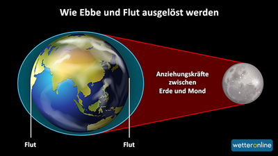 Die Anziehungskraft zwischen Erde und Mond wölbt einen Flutberg über die mondzugewandte Seite der Meere auf. Genau gegenüber bewirkt die Fliehkraft einen zweiten Flutberg. Das "fehlende" Wasser dazwischen formt zwei Ebbetäler.