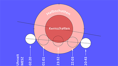 Anders als bei der letzten Mondfinsternis im Januar wird bei dieser Finsternis nur ein Teil des Mondes verdunkelt. Dabei wird der Vollmond ab 22 Uhr nach und nach vom Erdschatten immer mehr "angeknabbert", bis um 23:32 Uhr nur noch eine schmale Sichel übrig ist. Nach diesem Maximum der Finsternis kehrt das Sonnenlicht langsam wieder in die verdunkelten Bereiche unseres Trabanten zurück und ab 01 Uhr morgens erscheint der Mond wieder rund. Dann läuft er noch eine Weile durch den unauffälligen Halbschatten der Erde und wird dabei immer heller.