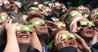 Falls das Wetter mitspielt und das Schauspiel gut beobachtet werden kann, lohnt sich also der Blick in den Himmel. Dies sollte allerdings nicht ohne geeignete Schutzmaßnahmen für die Augen geschehen. Denn selbst bei dieser Teilfinsternis ist das Sonnenlicht noch so grell, dass schwere Augenschäden riskiert, wer direkt in die Sonne schaut. Auch herkömmliche Sonnenbrillen bieten nicht genug Schutz. Vielmehr sollten Sie eine handelsübliche Finsternis-Brille benutzen und auf gar keinen Fall(!) durch ein Fernglas in die Sonne blicken.