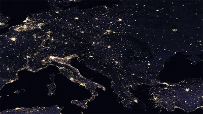 Aus dem Weltall ist die "Lichtverschmutzung" in Europa gut zu erkennen. Dabei stechen besonders die Benelux-Staaten und das Ruhrgebiet (oben links im Bild) sowie Teile Italiens heraus. Bild: NASA