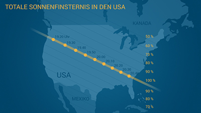 Wenige Tage vor dem großen Himmelsschauspiel über den USA warten Millionen Menschen gebannt auf das astronomische Top-Ereignis. Viele Interessierte sind sogar extra wegen der Sonnenfinsternis in die USA gereist, um irgendwo entlang des mehr als 4000 Kilometer langen Totalitätspfades Position zu beziehen. Hotels und Pensionen dort sind schon seit Monaten, ja teils sogar schon seit Jahren ausgebucht. Der Fahrplan der Finsternis steht fest, nur das Wetter könnte den Beobachtern mancherorts noch einen Strich durch die Rechnung machen.