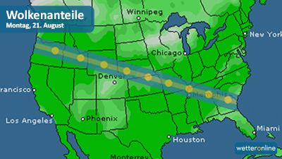 In den meisten Landesteilen stehen die Beobachtungschancen aber recht gut: Großflächige Wolkenfelder sind eher nicht zu erwarten. Allerdings können im Bereich regionaler Hitzetiefs kräftige Wärmegewitter entstehen und die Beobachtung vor allem in den zentralen Bundesstaaten und in Atlantiknähe regional zur Glücksache machen. Weil sich die zugehörigen Quellwolken erst im Lauf des Tages bilden, ist eine genaue Wolkenprognose derzeit aber noch nicht möglich. Die besten Wetterverhältnisse herrschen wohl ganz im Westen und östlich des Mississippi.