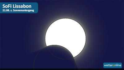 In Europa ist nur ganz im Südwesten und Westen ein Teil der Finsternis zu sehen. Die Grafik zeigt den Blick aus Lissabon, wo kurz vor Sonnenuntergang immerhin knapp 20 Prozent der Sonne vom Mond verdeckt werden.