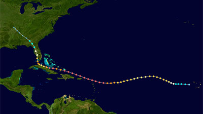 Der Rekord-Hurrikan pflügte sich ein Mal komplett durch die Karibik und durch ganz Florida. Die Schadensspur war viel breiter als die hier markierte Zugbahn des Sturmkerns.