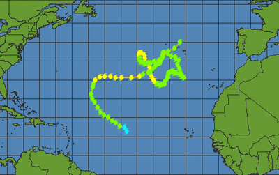 Tropensturm "Nadine" hatte eine ungewöhnliche Zugbahn und war vor allem bei den Azoren aufgrund sehr schwacher, wechselnder Höhenwinde einige Zeit quasi stationär. Bildquelle: Weather Underground