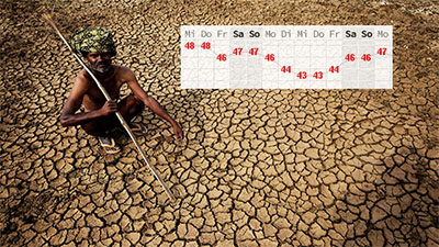 Extreme Hitzewellen mit Werten von bis zu 50 Grad kommen in Indien immer wieder vor. Vor allem zum Ende der Trockenzeit kurz vor dem Einsetzen des Monsuns werden regelmäßig sehr hohe Temperaturen erreicht, da der völlig ausgedörrte Boden die Aufheizung noch verstärkt. Die Hitze ist eine enorme Belastung für Mensch und Natur, der Beginn des Monsuns mit heftigen Gewittern ist daher für die meisten Inder trotz der dann häufig auftretenden Überschwemmungen ein Freudentag.