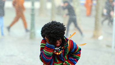 Düsseldorfer Narren suchen Schutz vor Sturmböen und peitschendem Regen. In der Landeshauptstadt wurde der Rosenmontagszug wetterbedingt abgesagt - zum ersten Mal seit dem Orkan von 1990. Bild: dpa