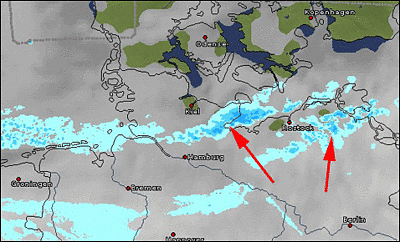 Schmale Schauerlinien ziehen von der Ostsee her landeinwärts und bringen Schnee mit. Bildquelle: WetterOnline Mitgliedschaft