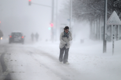 Eine Frau kämpft mühsam gegen starken Schneefall und Sturm an. Heftige Wetterkapriolen haben im Norden Frankreichs zu chaotischen Verkehrsbedingungen geführt, hunderte Menschen schneiten auf den Autobahnen in ihren Fahrzeugen ein. Fast 70.000 Haushalte waren zeitweise ohne Strom. Bildquelle: AFP