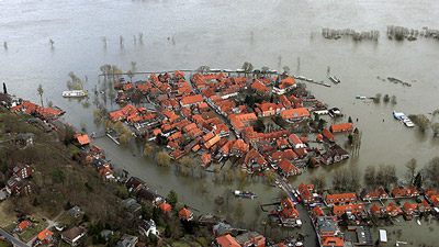 Die Altstadt des niedersächsischen Städtchens Hitzacker gleicht einer Insel. Der Pegel der Elbe steht dort am 9. April 2006 bei 7,63 Meter, 13 Zentimeter höher als bei der Jahrhundertflut 2002. Bild: dpa