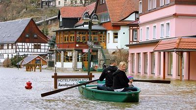 Der Kurort Rathen am Fuße des Elbsandsteingebirges im Südosten Sachsens wird überflutet. Viele Häuser sind nur noch mit Booten erreichbar. Bild: dpa