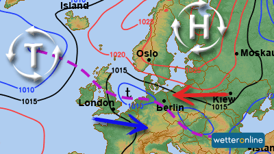 Der Grund für die über Tage quasi stationären Starkregenfälle war in der Wetterlage zu finden: Ein mächtiges Hoch über Skandinavien drückte die Warmluft in den Nordosten des Landes, während ein Tief über dem Atlantik versuchte, sich mit deutlich kühlerer Luft durchzusetzen. Da aber weder Hoch noch Tief dies letztlich schafften, zogen im Übergangsbereich der extrem unterschiedlichen Luftmassen aus Südosten immer wieder kräftige Regengebiete über die Landesmitte hinweg. Anschließend konnte das Hoch die Luftmassengrenze zögernd auflösen.