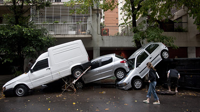 Der Gewittersturm trifft auch die argentinische Hauptstadt Buenos Aires schlimm. Die Fluten haben etliche Autos mitgerissen, ineinander geschoben finden sich die Fahrzeuge in den nächsten Straßenzügen wieder. Bild: dpa