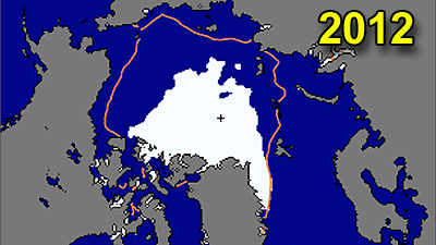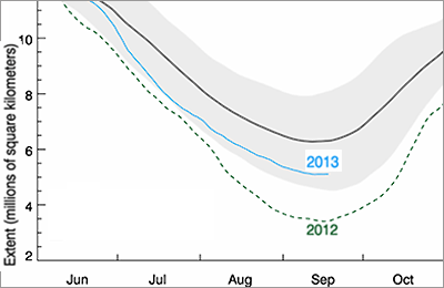 Das Eis im Nordpolarmeer ist in diesem Jahr deutlich weniger stark abgeschmolzen als im Vorjahr. Das Minimum der Eisfläche beträgt rund 5 Millionen Quadratkilometer, das sind satte 50 Prozent mehr als in 2012. Die auf den ersten Blick deutliche Zunahme trügt aber: 2012 gab es einen neuen Allzeit-Minusrekord mit nur 3,4 Millionen Quadratkilometern Eisfläche. Die Eisausdehnung in diesem Jahr ist trotz der Zunahme immer noch deutlich geringer als im langjährigen Mittel, außerdem ist die Eisdicke des neuen Eises meist nur sehr dünn.