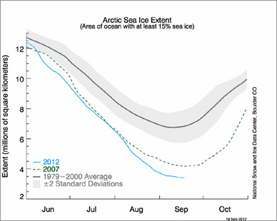 Die Eisbedeckung in der Arktis hat einen neuen historischen Tiefststand erreicht. Mit einer aktuellen Ausdehnung von etwa 3,4 Millionen Quadratkilometern wurde der alte Rekord von 4,2 Millionen Quadratkilometer aus dem Jahre 2007 deutlich unterboten. Der Vergleich mit dem Durchschnittswert der Jahre 1971 bis 2000 verdeutlicht die Dramatik der aktuellen Situation: In diesem Zeitraum hatte das arktische Eis eine durchschnittliche Ausdehnung von 7,5 Millionen Quadratkilometer, also mehr als doppelt so viel wie in diesem Jahr.