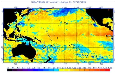 Das Wetterphänomen El Niño hat sich zurückgemeldet. Erste Hinweise darauf ergaben sich aus den Wassertemperaturen im tropischen Pazifik seit dem späten Frühling. Mittlerweile wird offiziell von einem El Niño Ereignis gesprochen. Derzeit liegen die Wassertemperaturen im Umfeld des Äquators großflächig deutlich über den langjährigen Durchschnittswerten. Betroffen ist ein mehr als 5000 Kilometer langer Gürtel etwa zwischen den Gilbert Inseln im Westen und der Westküste Kolumbiens im Osten.