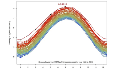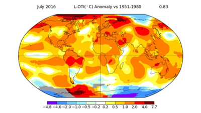 Der Juli ist weltweit betrachtet der wärmste Monat seit Beginn der Wetteraufzeichnungen vor fast 140 Jahren gewesen. Damit ist es der 15. Rekordmonat in Folge. Er übertraf den bisherigen Rekord um rund 0,1 Grad. Somit war der Juli fast zwei Grad wärmer als der globale Jahresdurchschnitt und 0,84 Grad wärmer als das Julimittel der Jahre 1951 bis 1980. Nach 2014 und 2015 wird es in diesem Jahr mit großer Sicherheit das dritte Mal in Folge auch einen neuen Wärmerekord bei der Jahresmitteltemperatur geben.