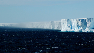 Eiskante des Shelfeises im Weddell-Meer. In den letzten Jahren mehren sich die Anzeichen, dass dieser gewaltige schwimmende Eisgürtel aufgrund der allmählich ansteigenden Luft- und Wassertemperaturen instabil werden könnte. Bild: dpa