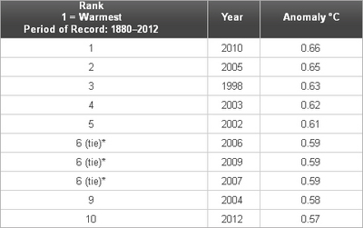 Die Tabelle zeigt die zehn wärmsten Jahre seit Beginn der Messungen. Auf Platz 1 steht 2010 mit einer Abweichung von 0,66 Grad Celsius, 2012 belegt den zehnten Platz mit einer Abweichung von 0,57 Grad. Bildquelle: NOAA