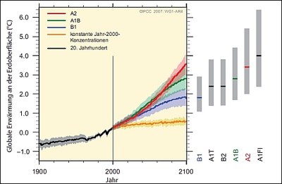 Bildquelle: IPCC - Im ungünstigen Fall, also ohne entschlossene Maßnahmen zur Minderung der Treibhausgasemission, setzt sich die Erwärmung unseres Planeten nach Einschätzung des Weltklimarats bis zum Ende des Jahrhunderts dramatisch fort.
