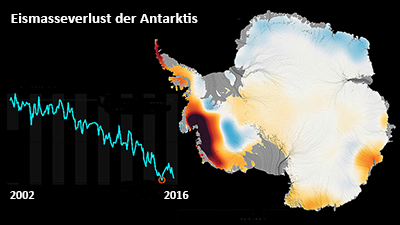 Nach Messdaten der GRACE-Überwachungssatelliten der NASA gingen dem Südkontinent seit dem Jahr 2002 im Durchschnitt jährlich rund 125 Gigatonnen Eismasse verloren. Das sind 125 Milliarden Tonnen Eis, die an den Rändern des Kontinents jedes Jahr mehr abgeschmolzen sind, als in seinem Inneren durch neues Eis ersetzt werden konnte. Vor allem die Westantarktis ist von den Masseverlusten betroffen. Hier eine Video-Animation der NASA welche die Eisschmelze der letzten 14 Jahre an den Rändern des kilometerdicken Eisschildes der Antarktis zeigt.