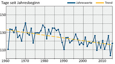 Seit dem Jahr 1961 hat sich die Vegetationsperiode, also die Zeit des Jahres in der Pflanzen wachsen, blühen und fruchten, bei uns um rund zwei Wochen verlängert. Schneeglöckchen, welche den Beginn des Vorfrühlings markieren, blühen im Schnitt drei Tage pro Jahrzehnt früher. Gleiches gilt für die Apfelblüte, die den Beginn des Vollfrühlings anzeigt. Auch über gesamt Europa hinweg verschiebt sich der Beginn von Frühling und Sommer pro Jahrzehnt rund 2,5 Tage nach vorn.
