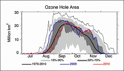 Das Ozonloch über der Antarktis ist in diesem Herbst durchschnittlich ausgefallen. Seine maximale Ausdehnung lag am 25. September bei rund 22 Millionen Quadratkilometer. 2008 war das Ozonloch noch 27 Millionen Quadratkilometer, 2007 25 Millionen Quadratkilometer groß gewesen. Die natürliche Ozonschicht des Planeten stellt einen Schutz des Lebens vor ultravioletter Strahlung der Sonne dar. Das Ozon bewirkt, dass harte Strahlung bereits in der unteren Stratosphäre daran gehindert wird, weiter ungehindert zur Erdoberfläche vorzudringen.