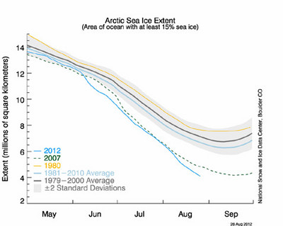 Nach dem Daten des National Snow and Ice Data Centers ist der bisherige Tiefstwert der arktischen Eisausdehnung von 2007 bereits jetzt schon deutlich unterschritten und liegt bei etwa 4 Millionen Quadratkilometer. Bildquelle: National Snow and Ice Data enter