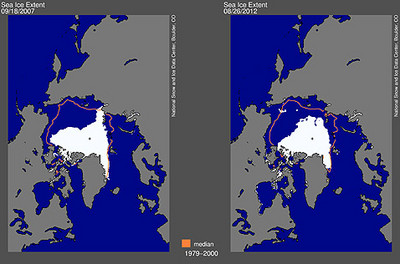 Der Vergleich der Eisfläche von Anfang September 2007 mit der vom 26. August 2012 zeigt, dass for allem nördlich von Sibirien noch mehr Eis abgeschmolzen ist. Die Passage von Skandinavien zur Beringstraße ist mittlerweile eisfrei und für Schiffe befahrbar. Bildquelle: National Snow and Ice Data enter