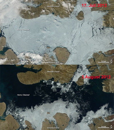 Der Vergleich der Satellitenbilder Von Mitte Juli zu Anfang August zeigt wie stark das Eis schmilzt. Der Perry Channel, eine Meerenge im nördlichen Teil der Nordwestpassage, war demnach schon Anfang August weitestgehend eisfrei. Würde sich dies in der Praxis bestätigen -dünne Eisflächen werden vom Satelliten nicht registriert-, dann werden in den kommenden Wochen einige Schiffe die Abkürzung nutzen. Bildquelle: NASA