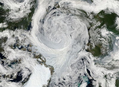 Ein heftiger Sturm Mitte August ließ die Eisfläche der Arktis zusätzlich schrumpfen. Bildquelle: NASA