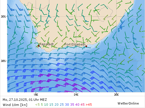 Mittwoch Vormittag: Wind aus Richtung 180 Grad mit Windstärke 6 Beaufort