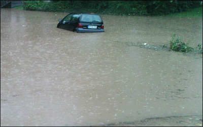Auch die teils enormen Wassermassen, die sich aus dem Starkniederschlagskern eines heftigen Gewitters ergießen, können verheerende Schäden anrichten. Der deutsche Rekord für Sturzregenfluten scheint beinahe unglaublich: 1920 soll in Füssen im Allgäu in nur 8 Minuten eine Niederschlagsmenge von 126 Litern pro Quadratmeter gefallen sein! Aber auch schon weniger extremer Regen kann Überschwemmungen und Bodenerosionen hervorrufen und kleine Gebirgsbäche zu reißenden Flüssen anschwellen lassen. Besonders gefährdet sind Täler, Senken, Tiefgaragen, Keller und Unterführungen.