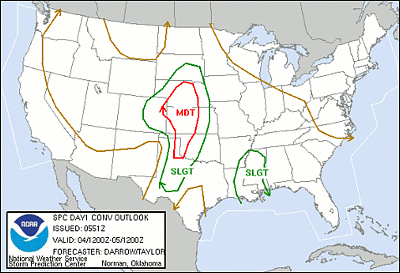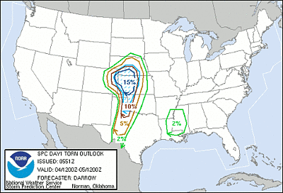 Tornado-Jäger legen sich Tag für Tag aufs Neue fest, welches "Einsatzgebiet" sie ansteuern. Für ihre Entscheidung ist einzig und allein die tagesaktuelle Wetterentwicklung ausschlaggebend. Eines der wichtigsten Hilfsmittel für die Routenplanung ist dabei der so genannte "Convective-Outlook" des "Storm Prediction Center" (SPC), einer auf die Überwachung und Vorhersage von konvektiven Sturmwetterlagen spezialisierten Abteilung des nationalen Wetterdienstes.