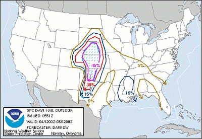 Die SPC-Wahrscheinlichkeitprognose für Großhagel am Freitag, den 4. Mai 2007, dem Tag des Greensburg-Tornados (F4) in Kansas!