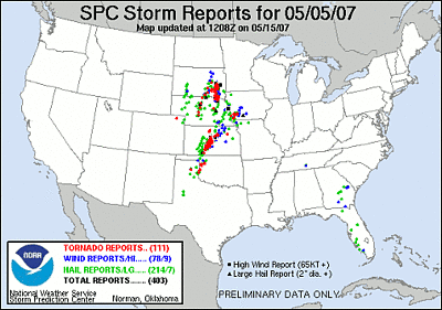 SPC-Reports von Freitag, den 4. Mai 2007: Meldungen über Tornadosichtungen, Hagel- und Gewitter-Fallböen (Downbursts)