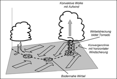 Die für jeden Tornado notwendige Wirbelrotation wird dabei nach der gängigsten Theorie von bodennah entgegengesetzt wehenden Winden entlang ihrer Grenzfläche in Gang gesetzt. Dabei hebt die Konvektion einer Schauerwolke nicht einen horizontalen Wirbel wie bei der Entwicklung von Superzellentornados, sondern nimmt vielmehr einen bereits vertikal organisierten Wirbel in ihren Aufwindbereich auf. Auch kleinräumige Windeffekte über stark gegliedertem Gelände können die Bildung derartiger vertikaler Rotationsimpulse unterstützen oder sogar maßgeblich anstoßen. Entscheidend ist allein, dass sich eine schlauchförmige Luftsäule bildet, die um eine vertikale Drehachse rotiert.