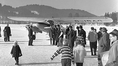 Ein Sportflugzeug startet im Februar 1963 vom Titisee im Schwarzwald. Im Februar ist die Eisdecke auf den meisten Gewässern so dick, dass sie mühelos schwere Lasten tragen kann. Bild: dpa