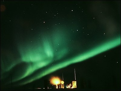 Elektrisch geladene Teilchen von der Sonne erzeugen grüne Bögen und Bänder über der Polarstation. Die Teilchen regen Atome in hohen Schichten der Erdatmosphäre zum Leuchten an. Polarlichter können sehr flüchtig sein, mitunter aber auch stundenlang am Himmel stehen.