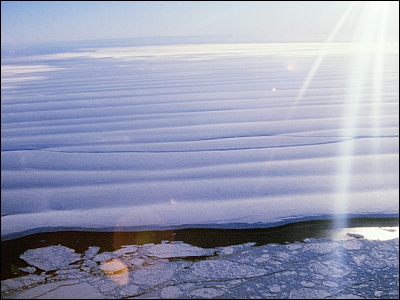 Lange dunkle Streifen zeigen, wie rissig die schwimmende Eisplatte an dieser Stelle ist. Entlang der Furchen wird sie nach und nach auseinanderbrechen. Dies ist ein natürlicher Vorgang. Entscheidend ist die Eisbilanz: Wenn mehr Eis abbricht als gleichzeitig aus dem Inland nachströmt, könnte dies ein Indiz für eine Klimaänderung sein.