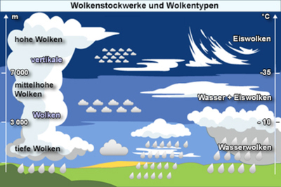 Man unterscheidet zwischen tiefen, mittelhohen und hohen Wolken. Innerhalb dieser Stockwerke tummeln sich insgesamt zehn unterschiedliche Wolkentypen, die sogenannten "Wolkengattungen".