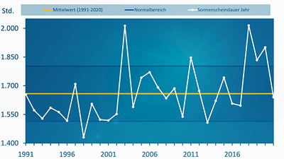 Die Sonnenscheindauer war landesweit gemittelt sehr durchschnittlich im Vergleich zur Referenzperiode 1991 bis 2020.