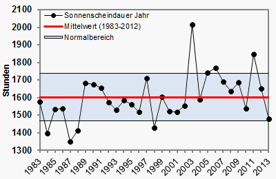 Völlig unterschiedliche Seiten gab es im Jahr 2013 beim Sonnenschein. Deutschland erlebte den trübsten Frühling seit 30 Jahren, dafür aber einen der schönsten Sommer. Im Herbst machte sich die Sonne wieder sehr rar, bevor gerade der Dezember recht sonnig ausfiel. Trotzdem reichte das nicht, um das Defizit aus dem ersten Halbjahr auszugleichen. Insgesamt war es das trübste Jahr seit 1998. Am sonnigsten war es mit über 1900 Stunden auf Rügen, das Schlusslicht bildete mal wieder der Kahle Asten im Sauerland mit nur etwa 1200 Stunden Sonnenschein.