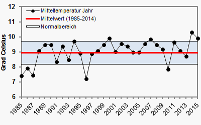 Das Jahr begann mit einem Paukenschlag. Zum ersten Mal in einem Januar wurden gleich an mehreren Orten über 20 Grad gemessen. Frostperioden waren im Winter dagegen eher selten. Die Temperatur markierte das ganze Jahr über neue Bestmarken. Das bayerische Kitzingen knackte im Sommer mit 40,3 Grad sogar den über zehn Jahre alten deutschen Hitzerekord. Auch zum Ende hin folgten mit dem November und Dezember zwei extrem warme Monate. Damit war 2015 mit einem Temperaturmittel von 9,9 Grad das zweitwärmste Jahr seit Beginn der Wetteraufzeichnungen.